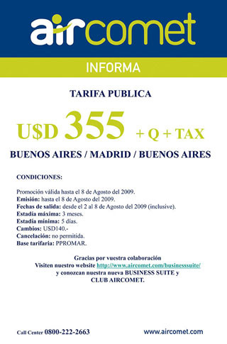 | Air Comet Informa: Tarifa pública: U$D 355 + Q + TAX - Buenos Aires / Madrid / Buenos Aires. Condiciones: Promoción válida hasta el 8 de agosto de 2009, emisión: hasta el 8 de agosto de 2009, fecha de salida: desde el 2 al 8 de agosto del 2009 (inclusive), estadía máxima 3 meses, estadía mínima 5 días, cambios USD 140, cancelación no permitida, base tarifaria PPROMAR.