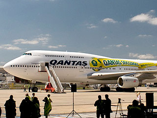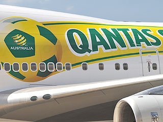 | Qantas presentó uno de los primeros aviones Boeing 747-400 “Qantas Socceroos” pintado con los colores de la Selección Australiana y un mensaje de buena suerte, en el Aeropuerto de Melbourne, en preparación para la Copa del Mundo 2010 de la FIFA.