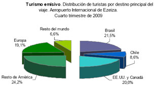 Por otra parte, 1.505.205 de turistas nacionales viajaron al exterior que gastaron U$S 2.333 millones, -8,1% menos que en 2008. El 42,1% de los turistas se alojó, en el cuarto trimestre de 2009, en hoteles 5 y 4 estrellas; el 24,7%, en hoteles de 3, 2 y 1 estrella; el 22,5%, en casa de familiares o amigos y el 10,7% lo hizo en otros tipos de alojamiento.